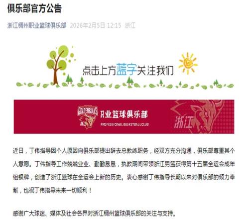 北京时间2月5日,在2025年12月25日,浙江男篮官方发布公告,表示主帅丁伟转任俱乐部男篮总教练。如今浙江男篮再度发布公告,丁伟指导因个人原因向俱乐部提出辞去总教练职务,经双方充分沟通,俱乐部尊重其个人意愿。